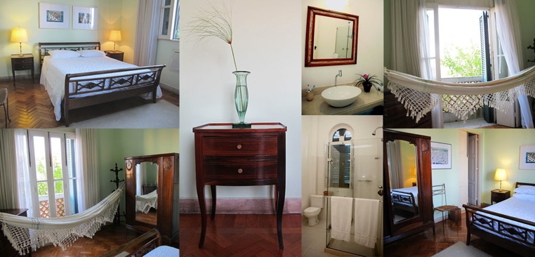The Corcovado Superior Room is a breezy corner room with a balcony and its own private bathroom, located outside of the room, just across the hall. The room has herringbone hard wood floors and is tastefully furnished with Brazilian antiques from the period of the home. There is a hammock on the center of the room from which you can gaze out onto the lush garden or through the balcony doors to the spectacular views of Sugar loaf, Guanabara Bay and Corcovado.